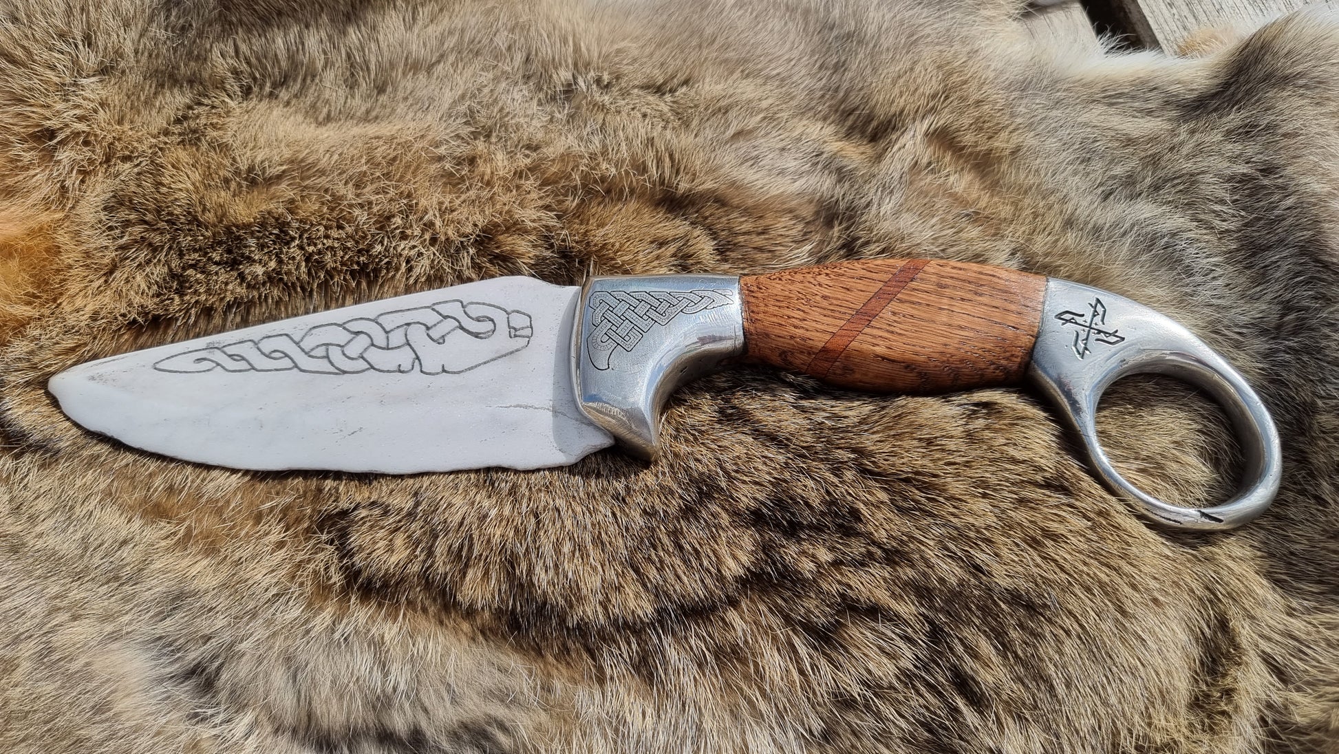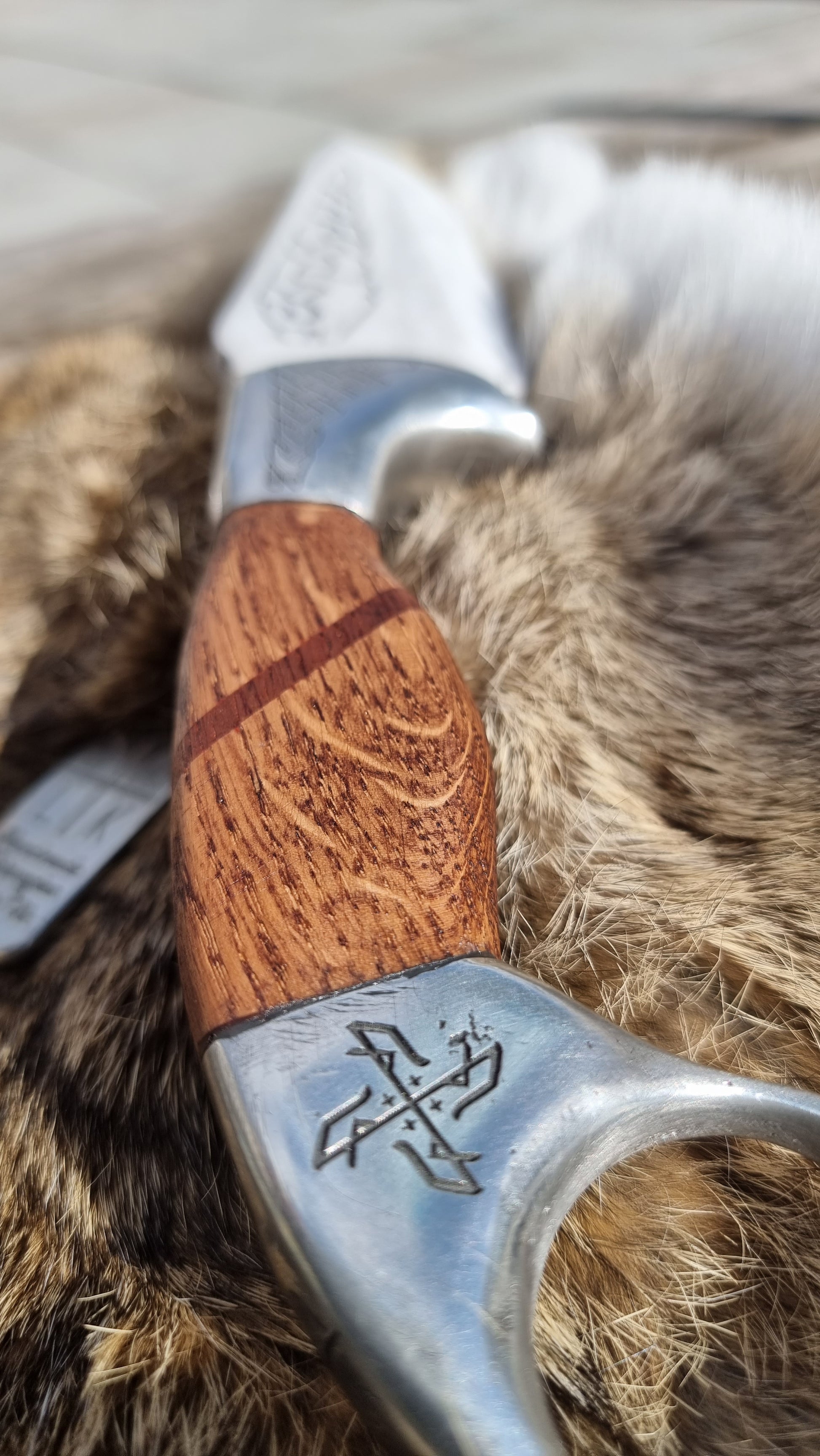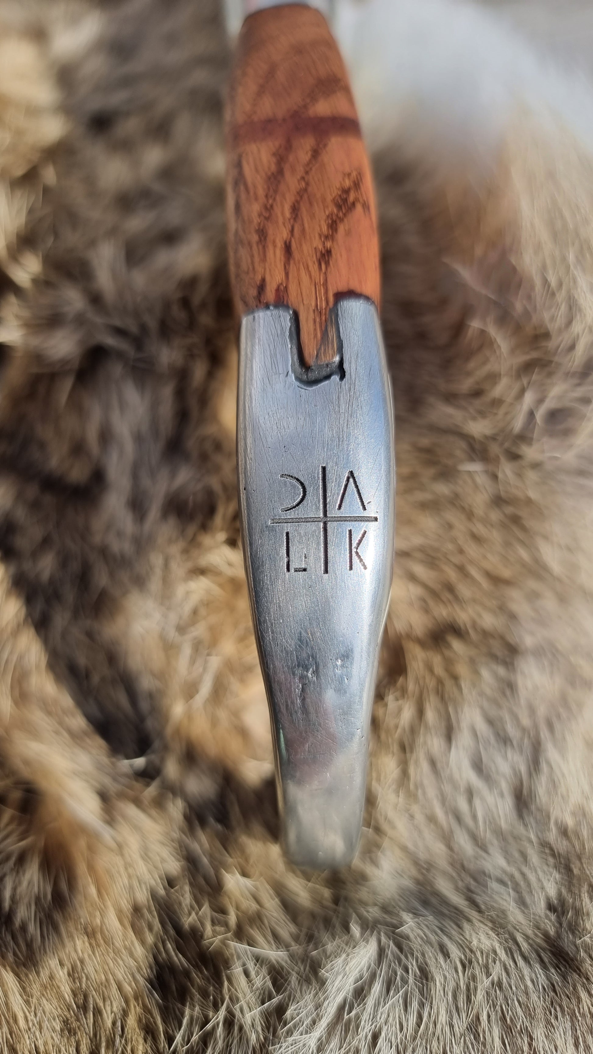 Unik karambit stil kniv laget av marmor, gravert med flotte dekorasjoner, håndtak av teak og eik med metalldetaljer i tinn