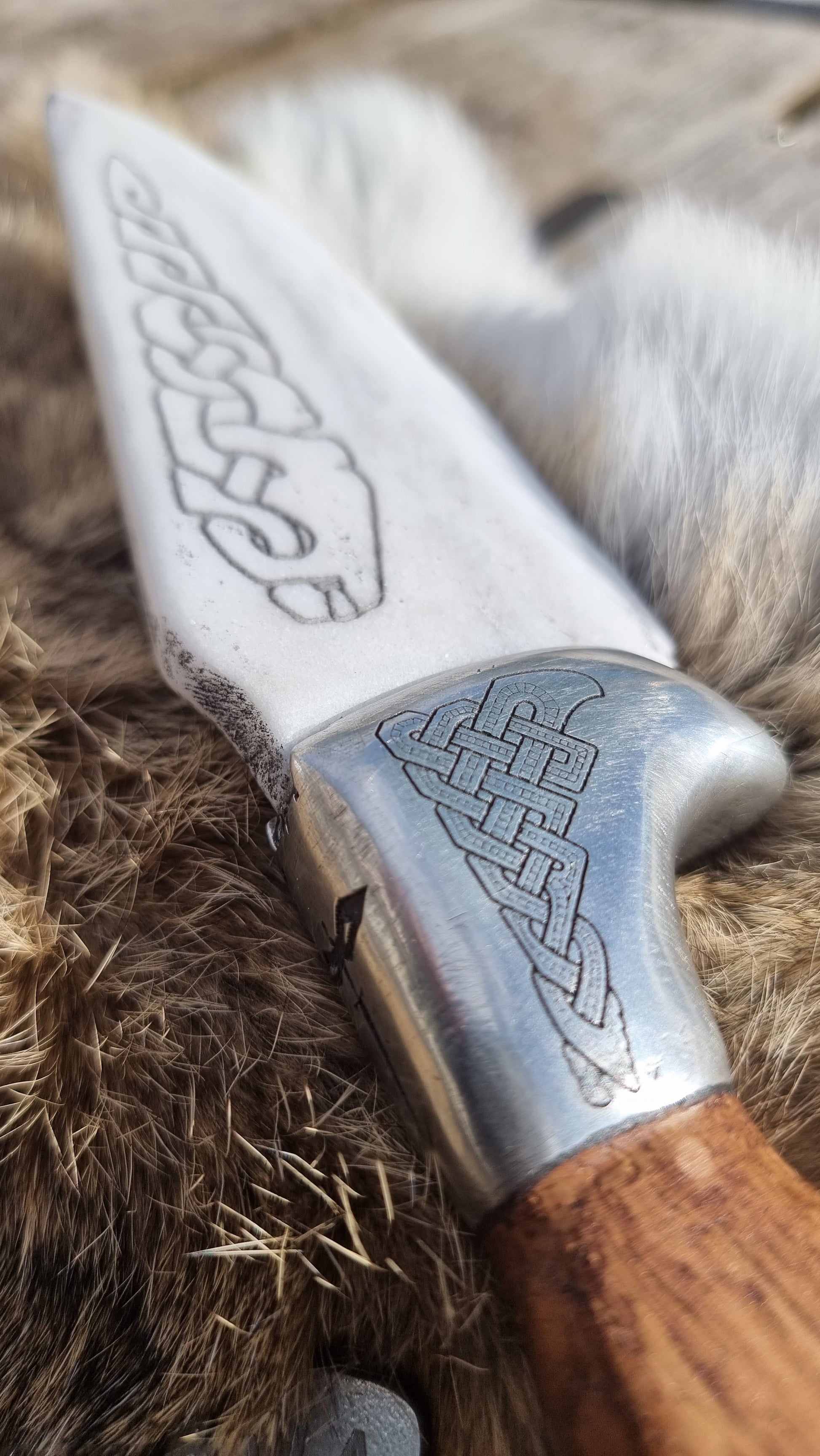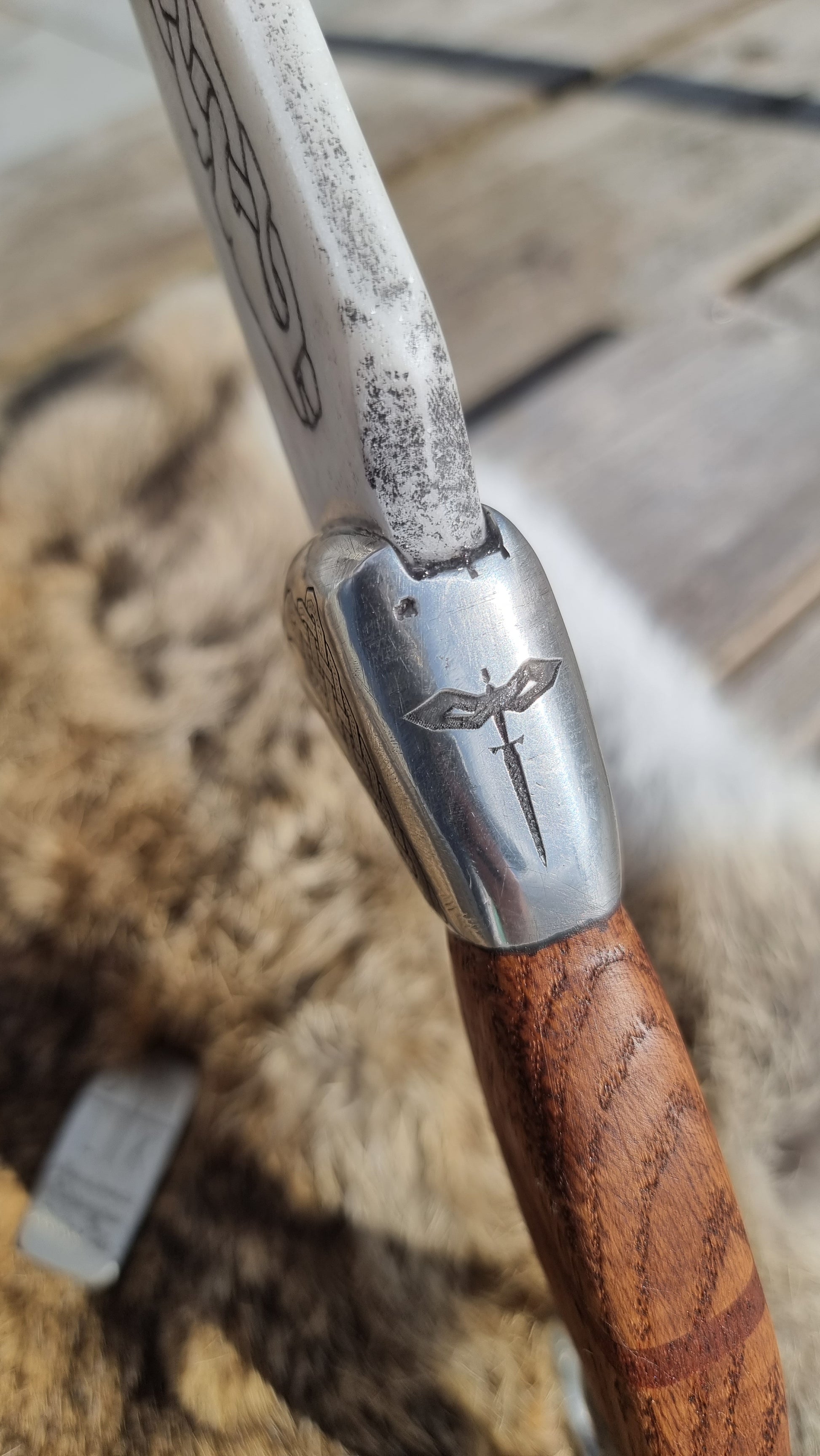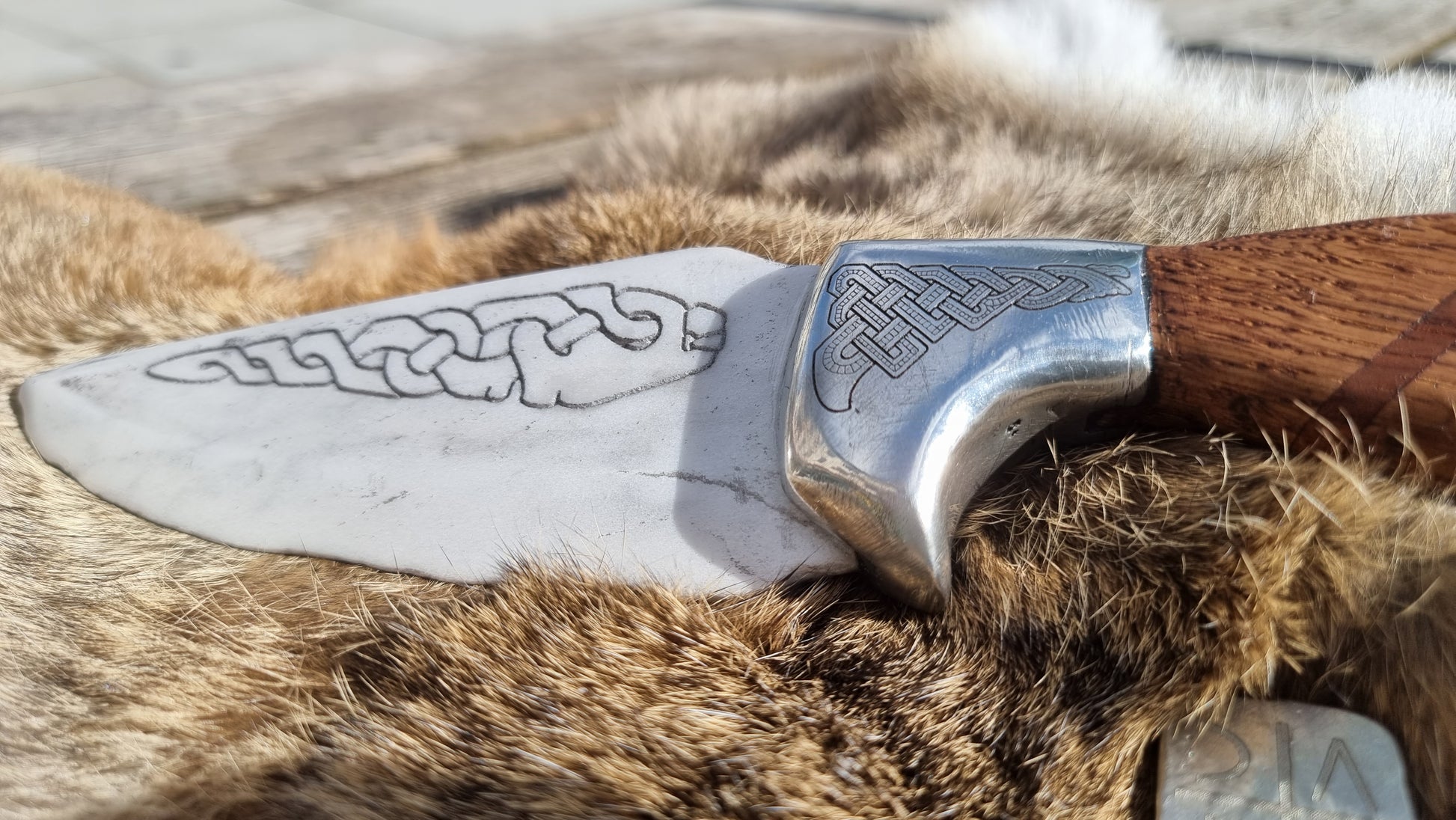 Unik karambit stil kniv laget av marmor, gravert med flotte dekorasjoner, håndtak av teak og eik med metalldetaljer i tinn